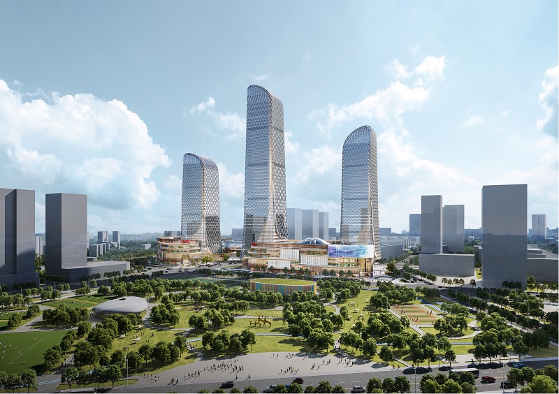 公司參與設計的55、57號地塊項目位于石家莊高鐵片區(qū)商務核心區(qū),正對石家莊站東廣場,項目總規(guī)劃用地面積106.35畝,設計以“山石為形”、取“昂揚向上”之意,由一主兩副三塔和裙房組成,建成后將成為石家莊市第一高樓。其中,57號地塊總建筑面積45.9萬平方米,規(guī)劃建設主塔高258米,副塔高200米;55號地塊總建筑面積20.6萬平方米,規(guī)劃建設塔樓高180米。項目通過空中連橋、地下商業(yè)與地鐵聯(lián)通,打造高品質購物、娛樂的多維立體商圈,建成后將成為集高端購物、會議展覽、商務辦公、休閑住宿等多功能于一體的地標建筑,重塑城市天際線,成為石家莊市經濟提升新動能。